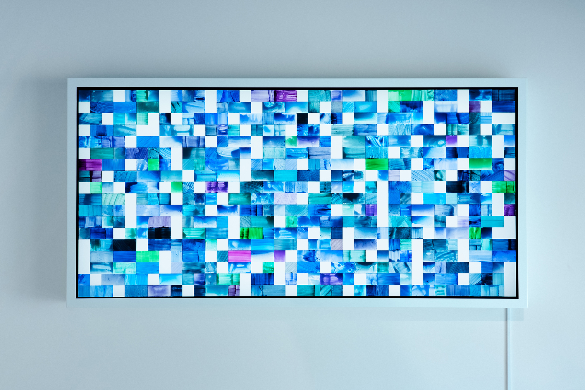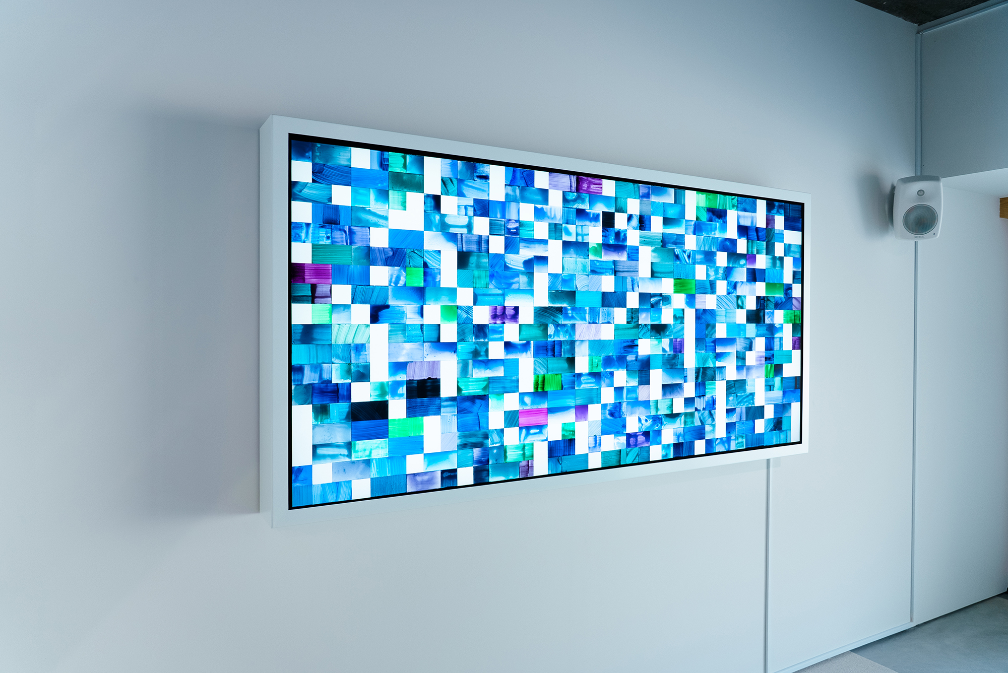 From his words, Kamimura extracted especially resonant passages and translated them into Morse code. These messages―intended for someone far away―are further transformed into patterns of color and light, as a method of conveying atmospheres and sensations that transcend the limits of verbal language.